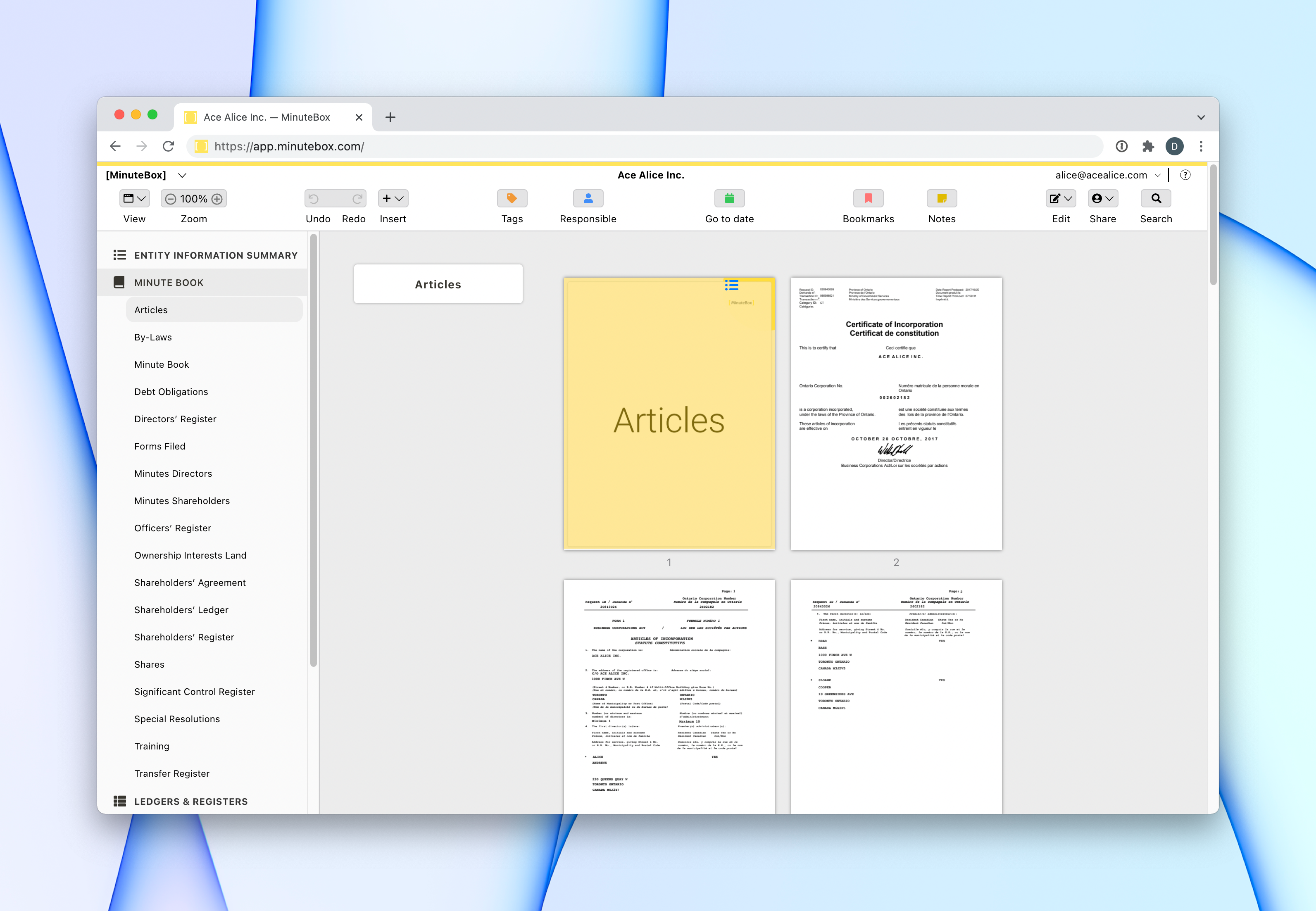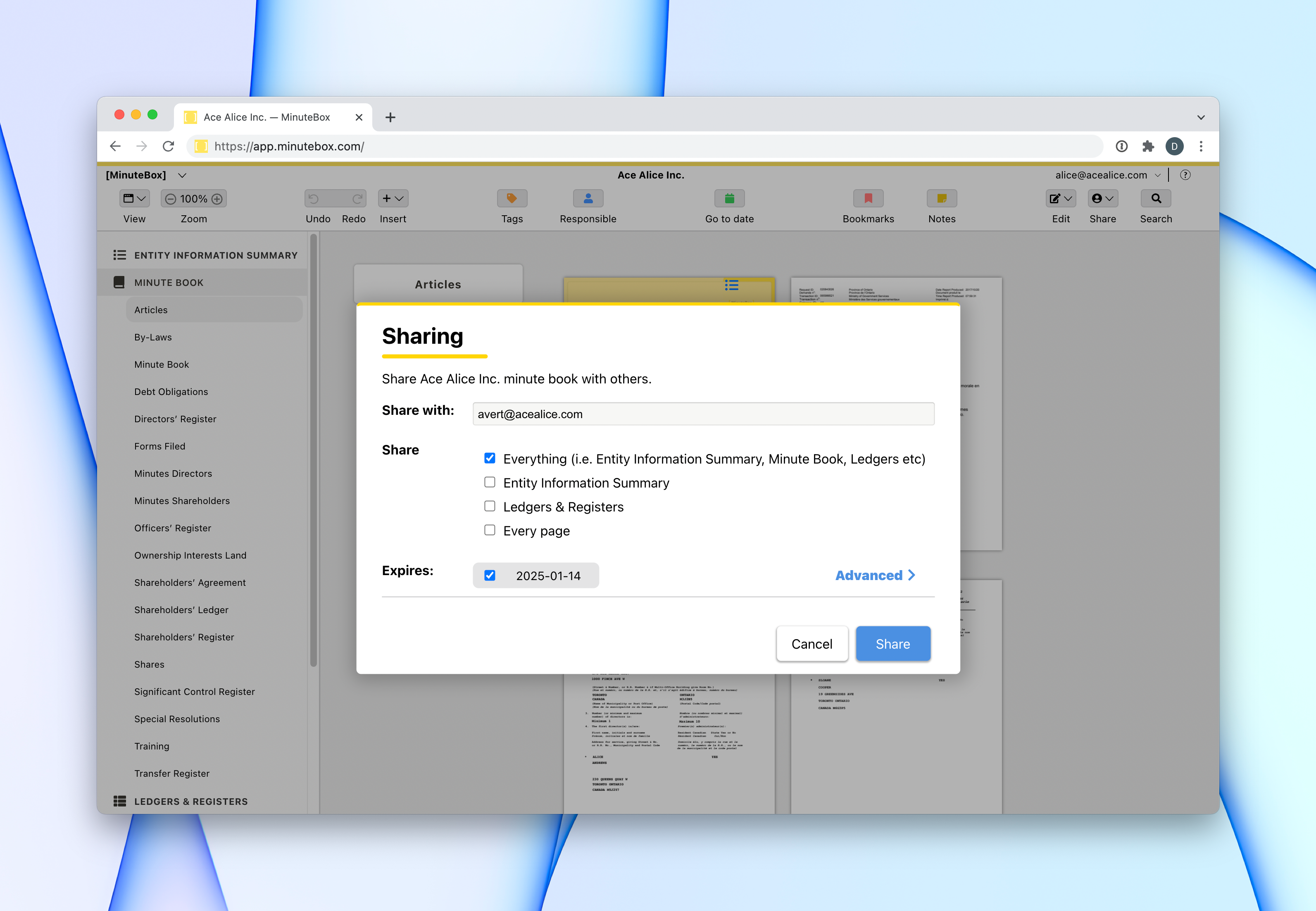 Secure share allows recipients to receive portal access to essential corporate and business records directly within MinuteBox. Stop sending PDFs via email.